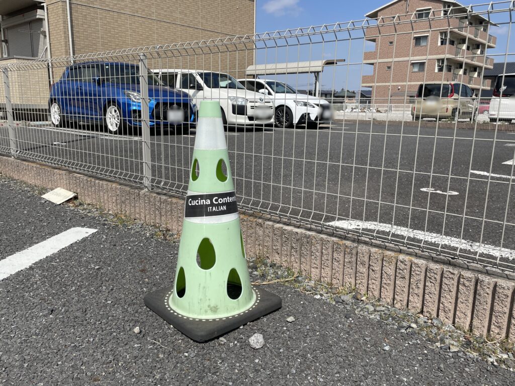 店舗敷地内の駐車場は2台。こちらのコーンが目印です。