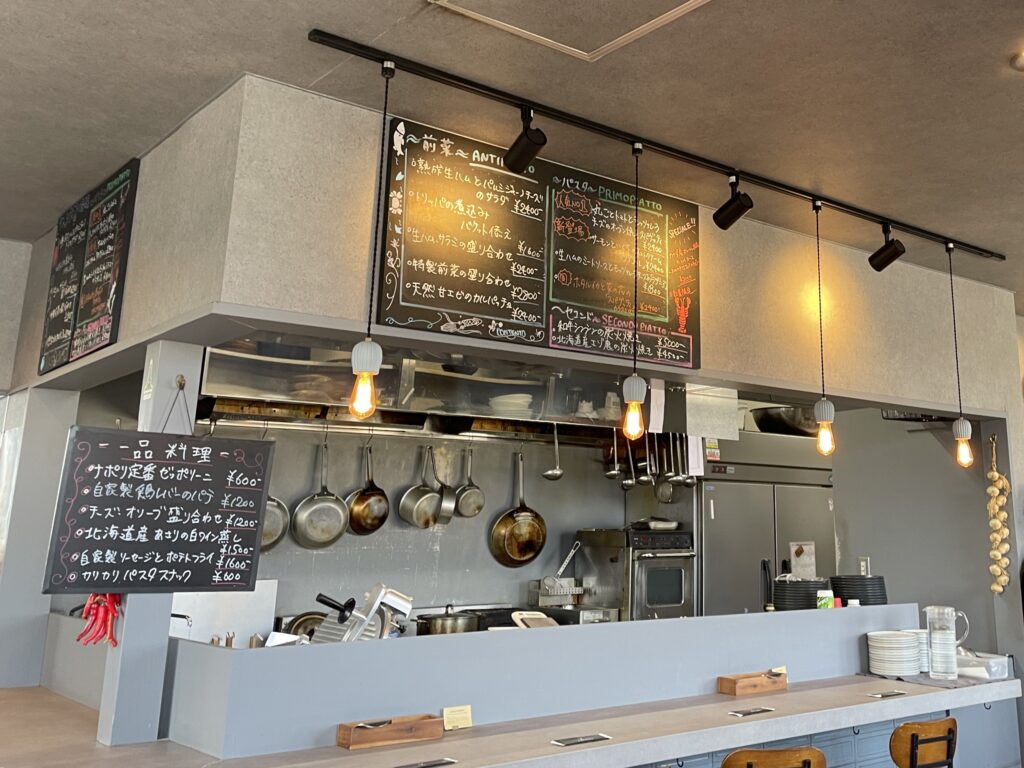 大きな黒板に手書きされたメニューと、ずらりと並んだフライパンが印象的です。調理風景が間近に見え、イタリアの街角にある食堂(トラットリア)のような活気と親しみやすさが感じられます。