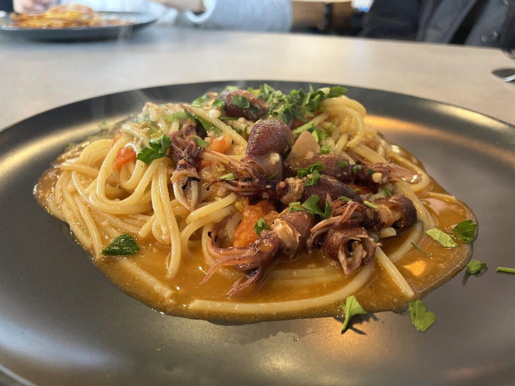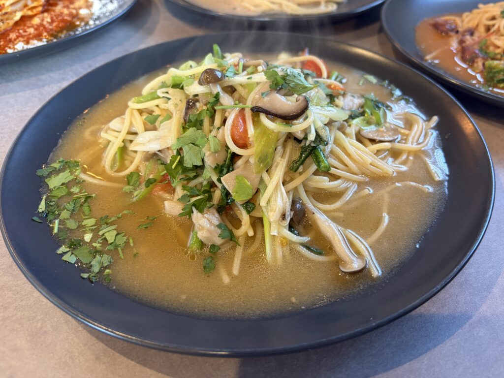 きのこやトマト、ネギや春菊などの野菜がたっぷり入った珍しいペペロンチーノ。ニンニクと鷹の爪がピリっとしたアクセントになっていて、食欲をそそるお味でした。