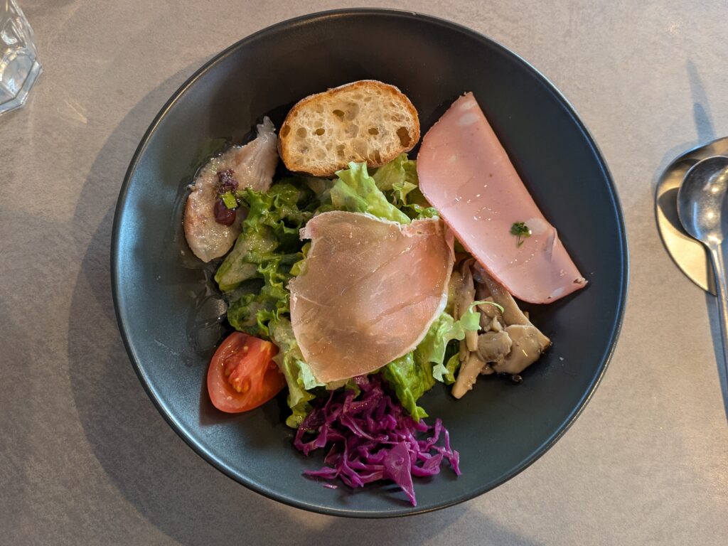 きのこのマリネ、タイのカルパッチョ、ハム、生ハム、バケット、紫キャベツのマリネ、トマト、グリーンリーフレタスの盛り合わせでした。奇をてらわないスタンダードな味付けで、ボリューミーでした。特に生ハムとハムがオススメです!