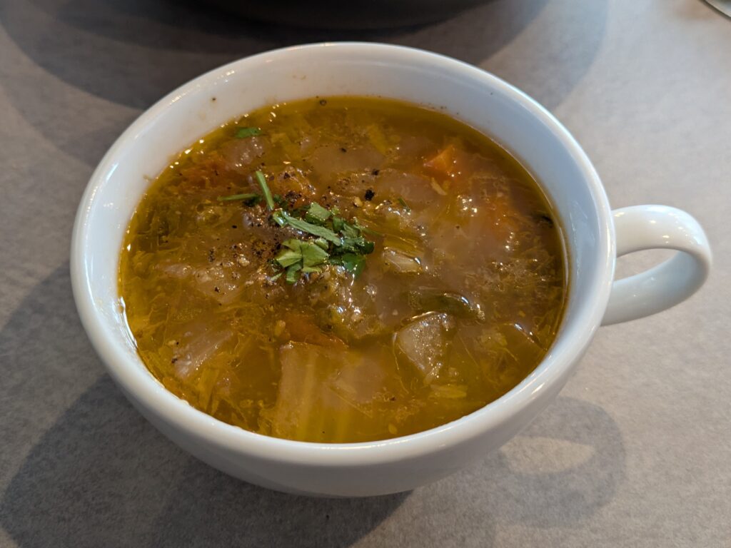 大きめの具がゴロゴロ入った、トマト感が少ないミネストローネです。熱々でサーブされ体が温まりました。