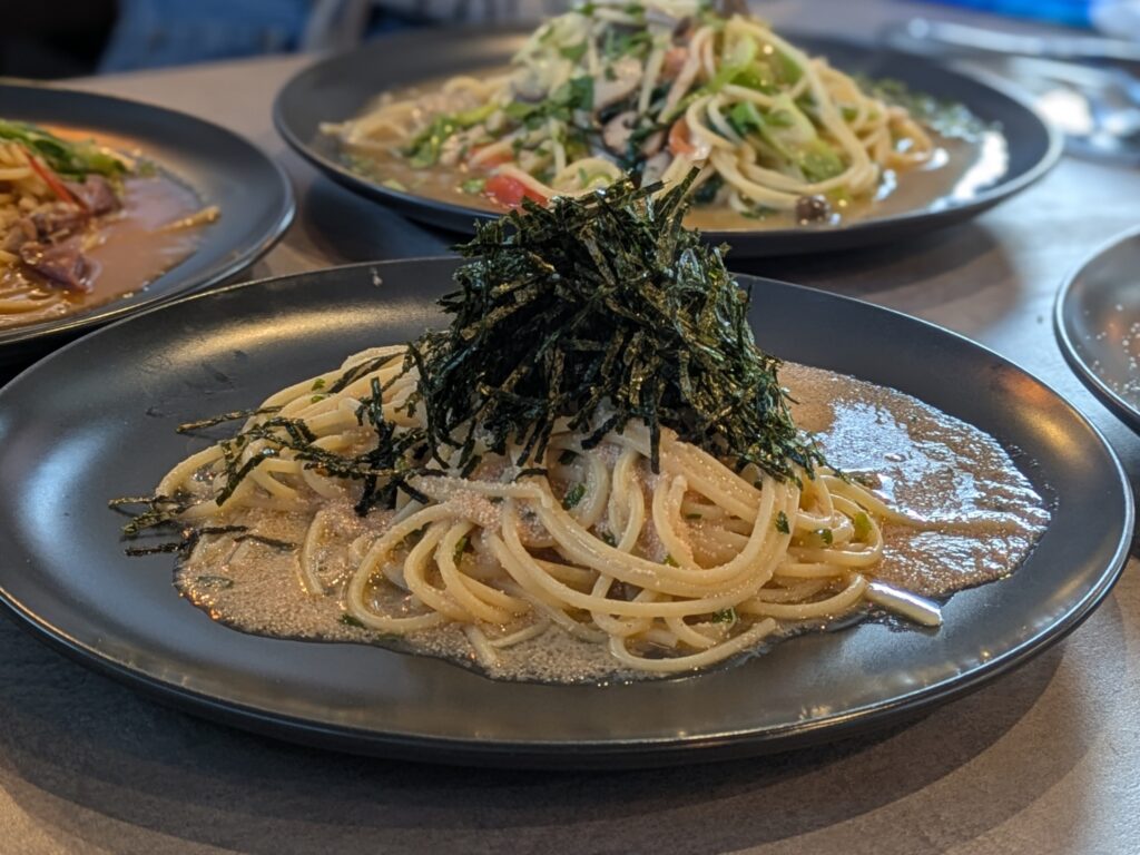 自家製のめんたいこが、これでもか!というぐらい入っている、贅沢なパスタです。海苔も山盛りで、絶妙な加減で茹でられたパスタと共にいただきます。明太子パスタって、塩味が強めになる印象ですが、塩味もちょうどよく美味しくいただきました。