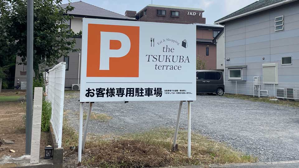 駐車場はお店の向かい側にあります。また、「the TSUKUBA terrace」の看板がある、隣の建物の奥にある駐車場にも停めることができます。