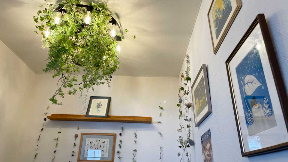 中に入ると、森の中にいるような雰囲気です。アオイオトではお馴染みの「リス」の絵、素朴なかわいらしい絵やアイテムが飾られています。