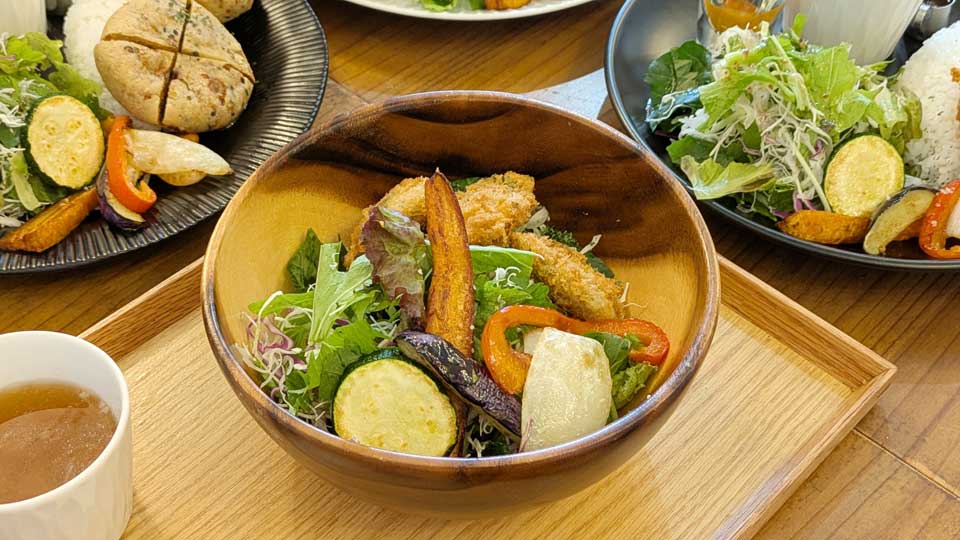 サラダボウルもいくつか種類があるのが珍しいですが、フィシュフライをチョイス。サニーレタス、キャベツ、水菜、サラダ小松菜などが入った、グリーン多めのボウルにフィッシュフライ、素揚げされた野菜(玉ねぎ、人参、ズッキーニ、パプリカ、ナス)が乗った、食べごたえのあるサラダプレートでした。