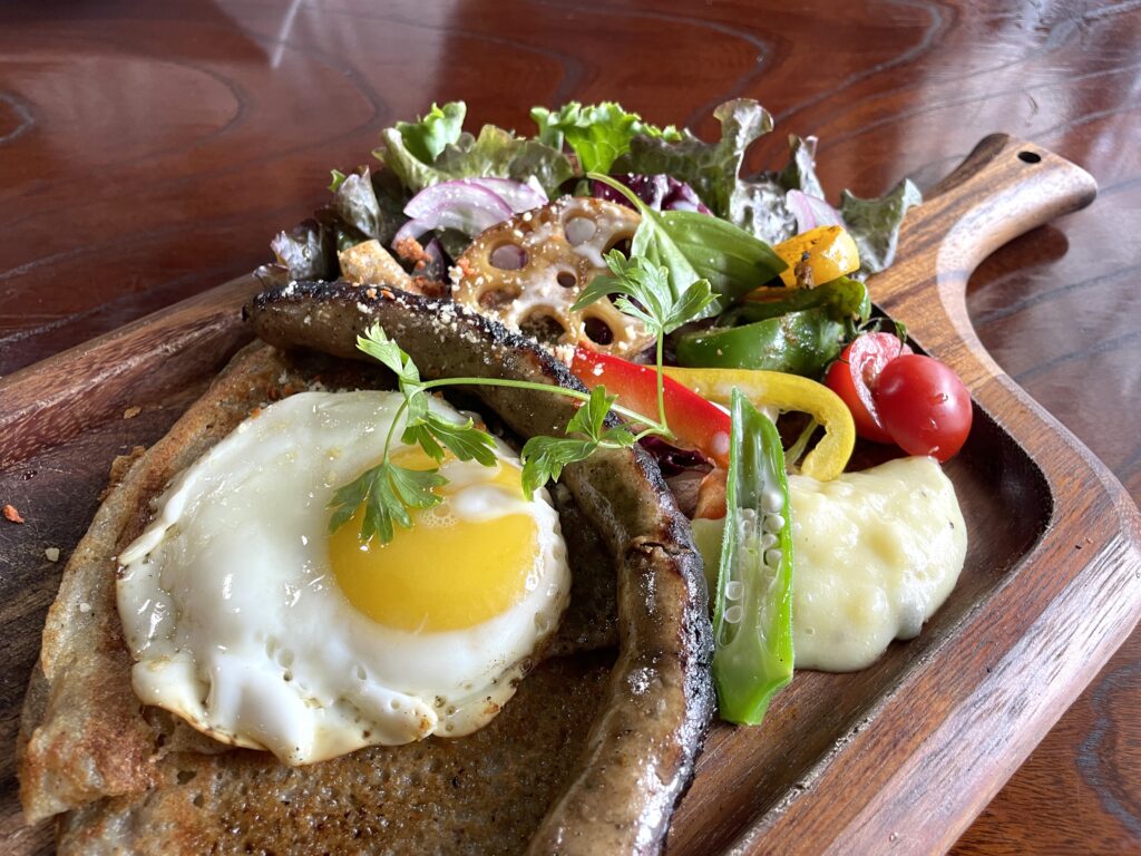 小川宣夫さん手作りの“ふき味噌”が練り込まれたスパイシーなソーセージに、半熟卵の黄身がとろっと絡む濃厚な一皿。野菜もたっぷりで、見た目以上に食べ応えがありました。