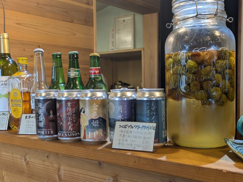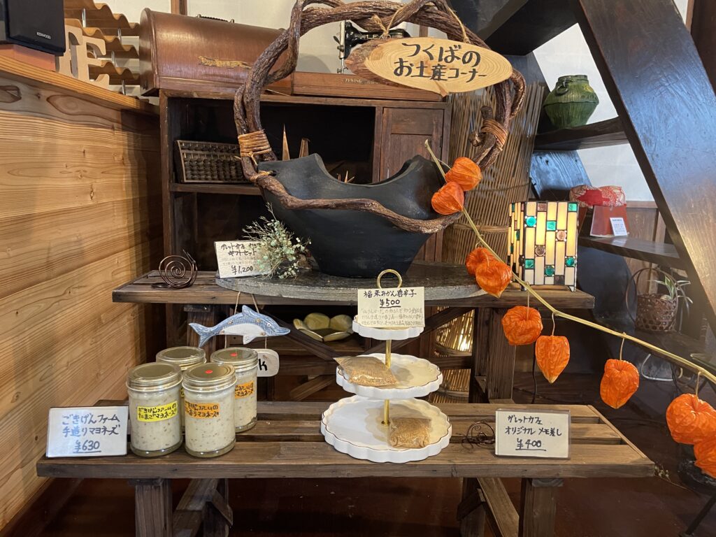 店内にはステンドグラスがあしらわれ、畳の間にはアンティーク調の家具や着物、帯が飾られていて、ゆったりとした時間が流れています。畳席だけでなく、土間部分のテーブル席もあり、一人でも友人同士でも居心地よく過ごせる空間でした。レジのそばには、つくばのお土産コーナーや、つくばブルワリーのクラフトビールが置かれていましたよ。