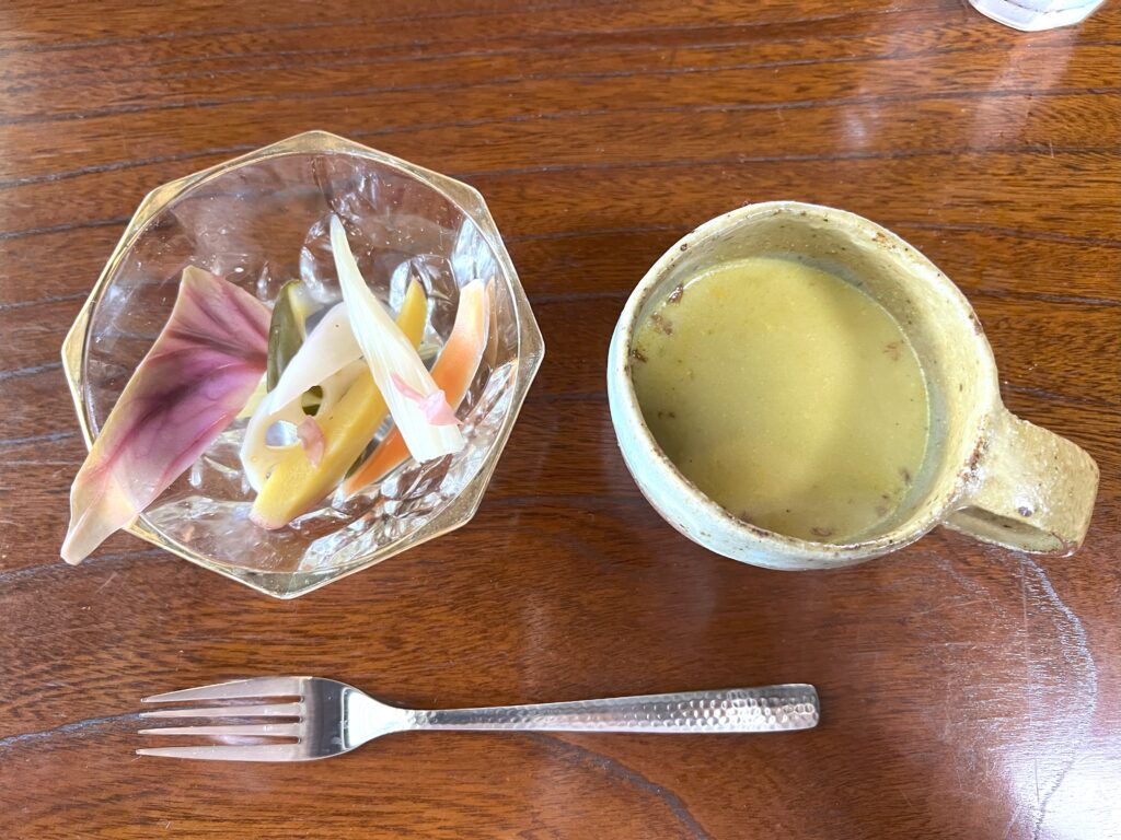 地元のお野菜を使った前菜のピクルスは、暑い夏にピッタリでした。パンプキンスープには、マッシュポテトや玉ねぎなどが入って、さらっとしながらも奥深い味です。