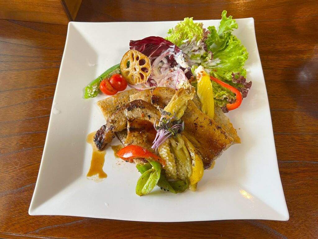 焼き茄子と豚ステーキは、バルサミコ醤油タレで味付けされています。和風ながらもバルサミコの味がアクセントになっていておいしいです。フレッシュな生野菜と焼きパプリカ・オクラも添えられていて、お野菜もたくさんいただけます。