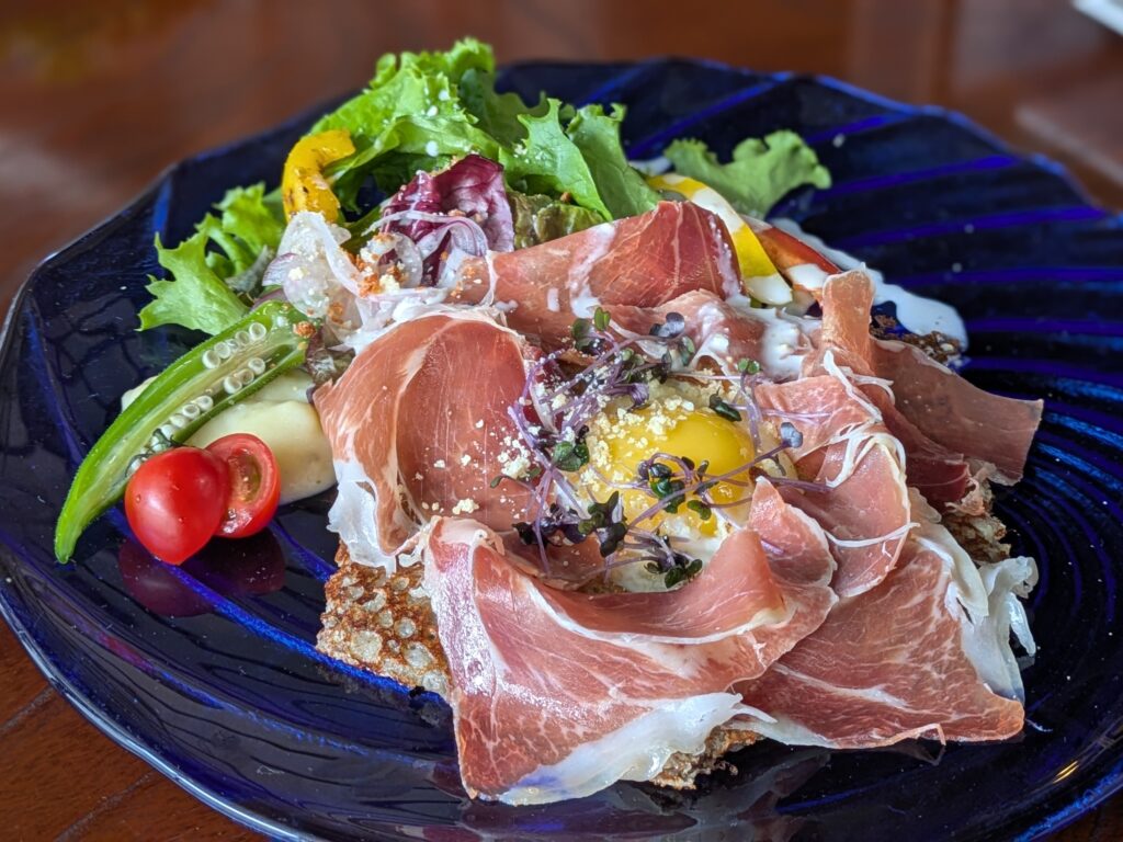人気No.1とのことで注文。青い器に盛られたたっぷりの野菜とプロシュート生ハム、平飼い卵の組み合わせは彩り豊かで、目でも楽しめる一品でした。